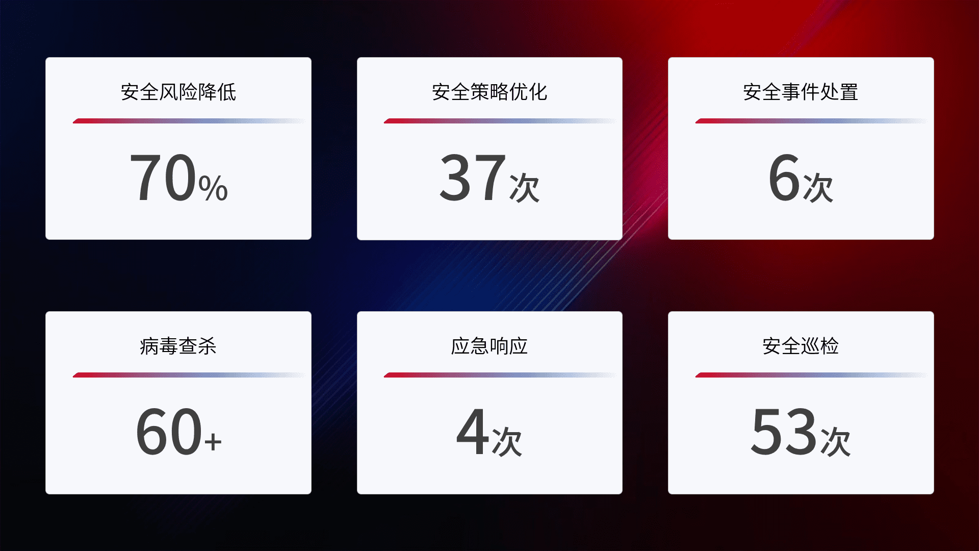 提供全面的安全事件报告体系,,,,包括处置报告、、、周报、、、、季度和年度总结,,结合持续监控,,,帮助客户深入了解网络安全状况。。。。